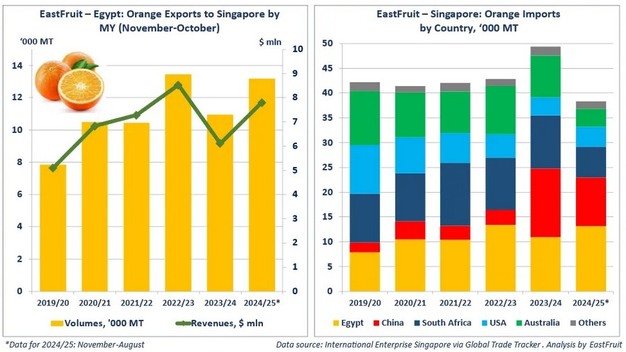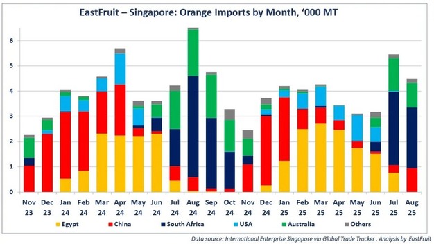 据 EastFruit 报道,继上一季出口下滑之后,埃及对新加坡的橙子出口量正在回升。2024 年 11月至 2025 年 8 月期间,埃及向新加坡出口了 13,200 吨橙子,价值 780 万美元。这比上一季增长了 20%,几乎与 2022/23 产季创下的纪录持平。凭借这一增长,埃及有望重新成为新加坡最大的橙子供应国。