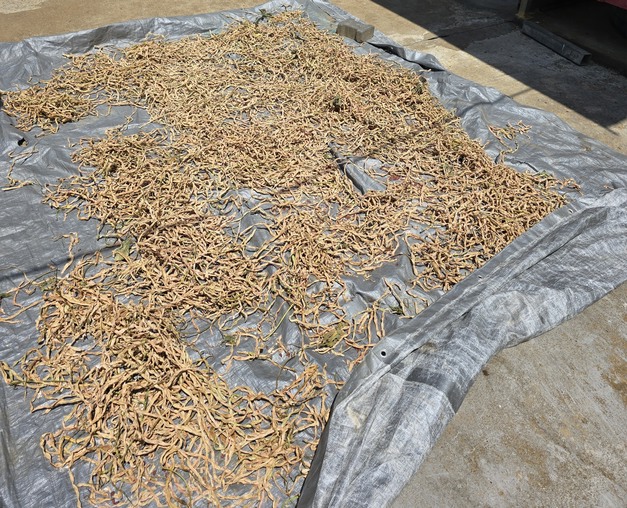 晾晒长豆。从晒干的蔬菜中提取种子,以备下一次收获。