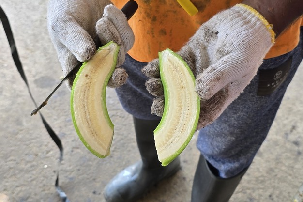 FAI 种植的是卡文迪许品种 CV902。Nitesh 说:"这个品种在这里生长得非常好。"在法国研究中心(CIRAD)的支持下,我们现在已经控制住了 moko 等病害。这确实需要一套严格的管理制度:对鞋类和工具进行消毒,每天为工人穿上干净的衣服,并对每块地实行严格的准入政策。"