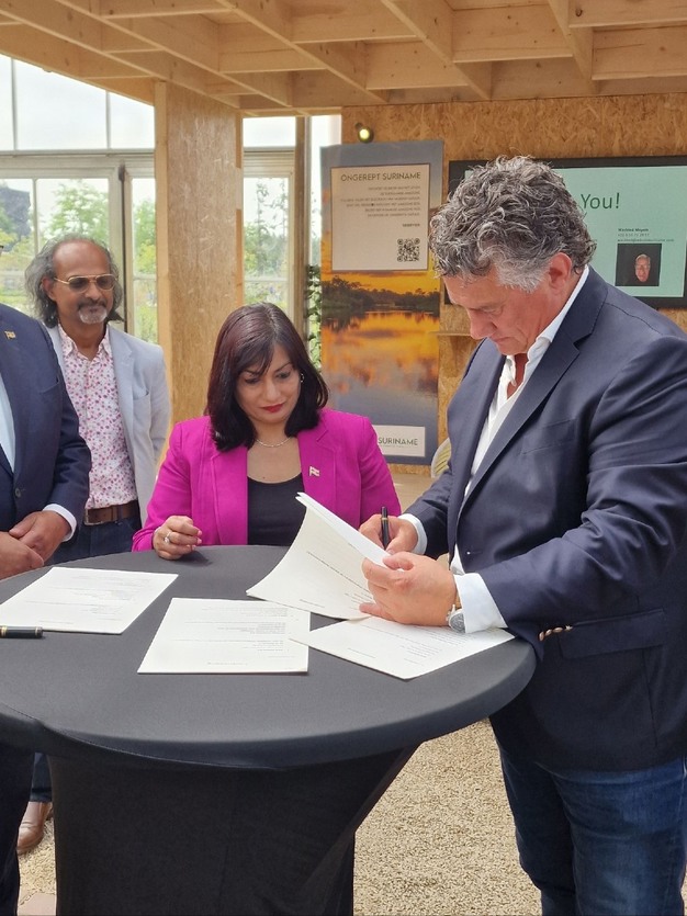 Kees Rijnhout 和前经济事务部长 Rishma Kuldipsingh 在 Floriade 签署意向书文件