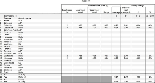 根据官方市场数据,第 41 周,拉丁美洲几家主要供应商的香蕉平均价格与前一周相比有所下降。