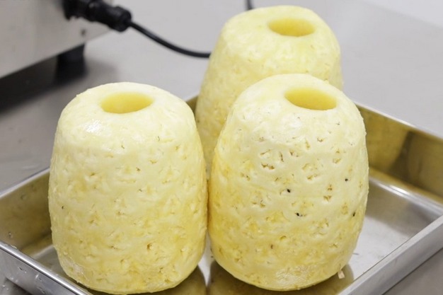 日本削皮机制造商 Astra 最近在 10 月份的 IFPA 展会上展示了其用于大规模凤梨加工的最新解决方案 "FAP-3000"。这种工业规模的机器可以同时对凤梨进行削皮和去核,帮助食品加工商节省时间和提高效率。