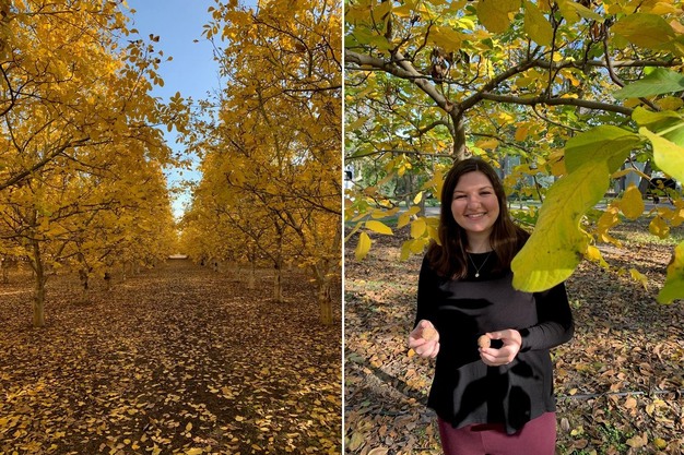 左图:11 月的核桃树。右图:Carriere 的女儿 Christina 正在收获核桃。
