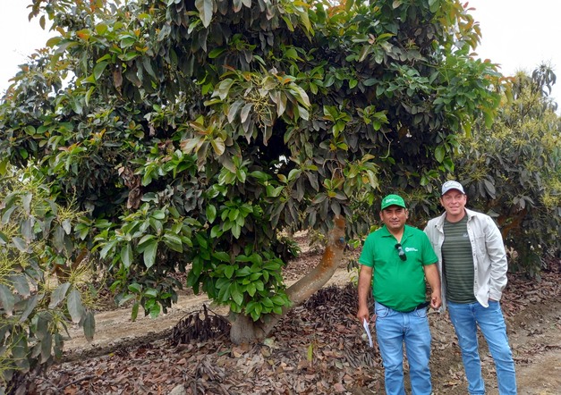 Guido García Mendoza(运营经理)和 Claudio Villegas(农场主)在一棵 Zutano 品种的树前。Villegas 说:"在这块 8 公顷的哈斯牛油果地里,大约有 105 棵 Zutano 树,它们起到了授粉的作用",经过与 Grupo Juan Ruiz 三年的合作,他强调,在整个种植和商业过程中,他都感受到了陪伴和支持。"此外,我不会因为丢弃果实而蒙受损失,因为集团购买了全部产品"。