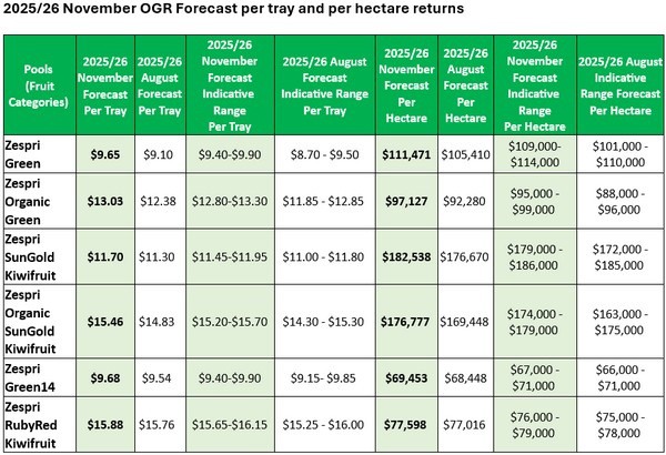 Zespri 发布了 11 月份对 2025/26 奇异果产季的预测,报告称所有奇异果品种的单托盘收益预计均高于 8 月份的预测。该公司表示,绿奇异果、有机绿奇异果和有机 SunGold 奇异果的收益目前已超过此前预测范围的上限。按每公顷计算,所有品种的收益预计均将创历史新高。