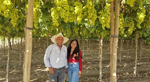 Jorge Nina Feria 和 Leidy Caso 在 Terramajes J&J 公司占地 2.5 公顷的甜球形葡萄田里。尼娜说:"我们的目标是每公顷产量达到 50-60 吨"。