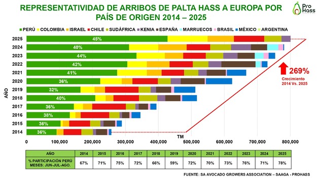2025 年 10 月,秘鲁哈斯牛油果的出口量达到 69.2 万吨,比 2024 年增加了 38%,而 2024 年在生产方面遇到了一些困难,主要是受厄尔尼诺现象和雅库气旋的影响。Medina 说:"今年,所有农业气候条件都已具备,田间产量得以恢复。"