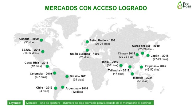 目前,秘鲁可以向 70 多个国家出口牛油果,但仍有一些市场有待开发,如台湾、越南、澳大利亚、新西兰和墨西哥。ProHass 最初是一个生产者协会,现在也将出口商聚集在一起。该协会有 70 个成员。11 月 17 日至 19 日,该协会组织了第七届拉丁美洲牛油果大会,共有 60 场技术演讲,1,200 多名与会者来自墨西哥、哥伦比亚、巴西、阿根廷、智利、危地马拉、多米尼加共和国、西班牙、美国和加拿大等国。