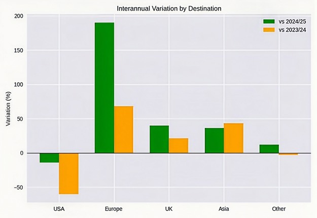 对美国的出口总量为 653 吨,占总量的 19%,较上季下降 14%,比 2023/24 年度减少 60%。欧洲大陆的出口有所回升,达到 606 吨,增长 190%;英国的出口量为 226 吨,增长 40%。其他地区的出口量为 81 吨,增长 12%。