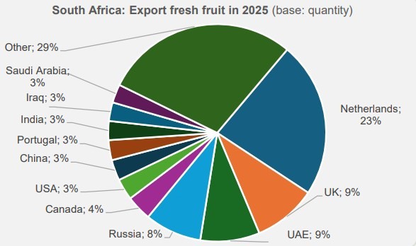 与去年相比,南非新鲜水果出口增长了近 20%。与 10 年前相比,增幅高达 66%。对荷兰和其他欧盟国家的出口也呈现类似的增长。到 2025 年,南非向欧盟国家出口的水果总量将超过160万吨。