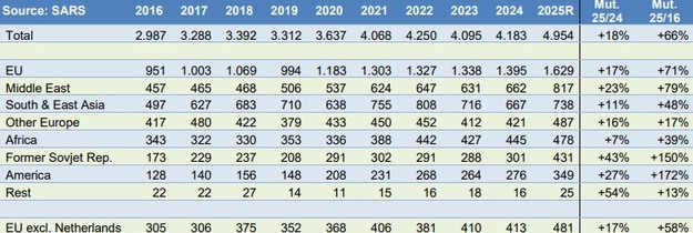 荷兰是迄今为止最大的欧洲买家,出口量达 115 万吨。葡萄牙紧随其后,出口量为 15 万吨,意大利位列第三,出口量超过 10 万吨。对中东的出口增长速度甚至超过了对荷兰的出口,与去年相比增长了 23%,与 10 年前相比增长了 80%。今年,对中东的出口总量达到 81.7 万吨,其中大部分(43.7 万吨)出口到了阿拉伯联合酋长国。