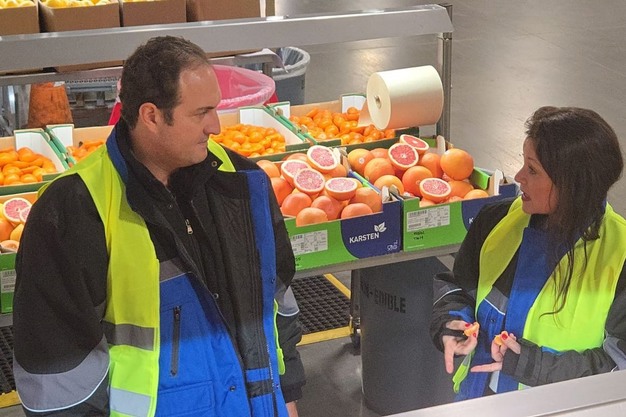 © South Africa Summer Citrus (DMA Solutions)(报道配图说明:小威廉·科普克公司的董事总经理威廉·科普克与苏汉拉·康拉迪在东海岸的科普克设施处合影,背景是来自南非的柑橘。)