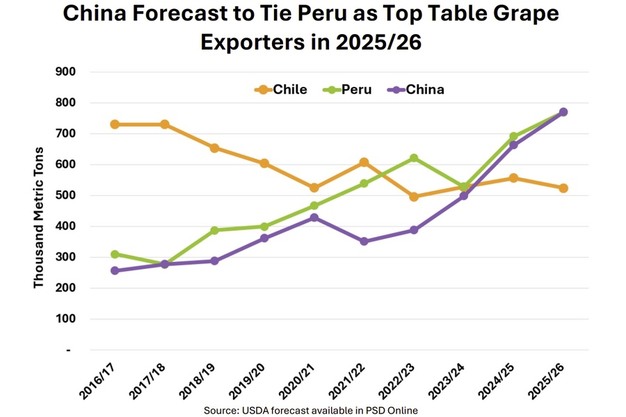 中国2025/26销售年度的鲜食葡萄出口量预计将增长16%,达到77万吨。若实现此目标,中国将首次与秘鲁并列成为全球最大的鲜食葡萄出口国,并在上一销售年度已超越智利。中国鲜食葡萄产量预计将达到1500万吨,同比增长6%。尽管种植面积趋于稳定,但由于使用了避雨棚和四季品种,单产持续提高。因此,在过去四年中,中国的出口量增长了一倍多,同时降低了对进口的依赖。进口量预计为10万吨,较四年前下降45%。