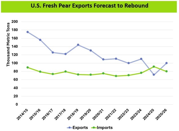 全球鲜食梨产量预计下降2%,至2610万吨,主要归因于中国和土耳其的产量下降。受山东和陕西干旱影响,中国梨产量预计减少48万吨,降至2050万吨。受霜冻灾害影响,土耳其产量预计下降30%,至46.1万吨。美国梨产量预计将增至56.5万吨,但仍处于历史低位。全球梨出口量预计为200万吨,中国、美国和欧盟出口量的增加,抵消了土耳其出口量的减少。