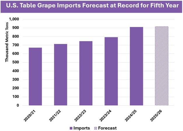 全球鲜食葡萄产量预计将增至3000万吨,主要受中国、印度、欧盟和秘鲁的产量增长推动。全球出口量预计为420万吨,主要得益于中国和秘鲁出口量的增加。同时,美国的鲜食葡萄进口量预计将小幅上升至91.5万吨。