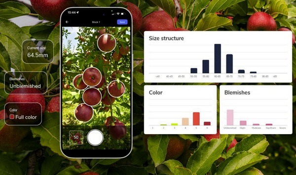 对于苹果生产,该工具能够测量采摘前后的果实大小、颜色和瑕疵。及早发现缺陷并持续跟踪生长和颜色变化有助于各团队实现分级标准的标准化。田间数据会被整合到中央仪表盘中,旨在支持预测、采摘计划以及生产团队和销售团队之间的协调。