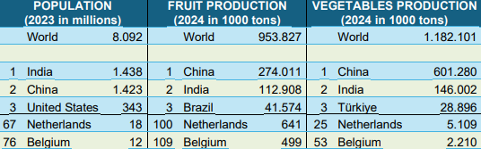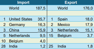 印度拥有近 15 亿人口,是世界上人口最多的国家。该国在全球果蔬生产中也扮演着重要角色,位居全球第二,远超中国。然而,作为新鲜果蔬贸易国,印度的地位仍然有限,在全球排名大约在 25 至 30 位之间。