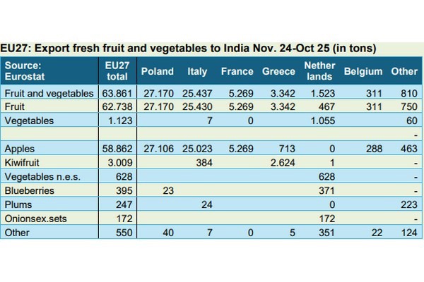 欧盟国家的进口量每年仅限于 6 万吨左右。波兰和意大利是主要供应国,尤其是苹果。此外,还有来自希腊的奇异果。荷兰和比利时的出口量很小。根据欧盟统计局的数据,荷兰去年向印度出口了大约 1,500 吨,比利时出口了 300 多吨,主要是苹果。不过,在一些较小的产品类别中,包括奇异果、橘子、梨和葡萄等,增长还是很明显的。
