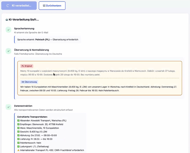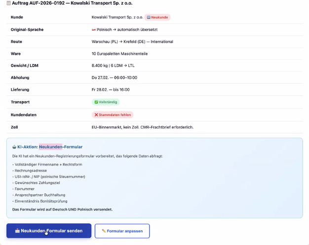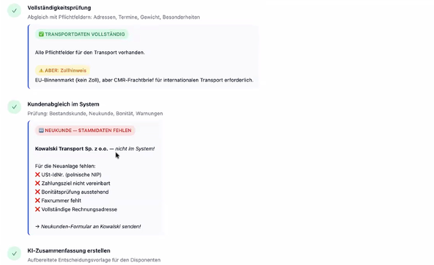 在 Claude AI 的帮助下,Hansult 将多个人工智能工作流集成到演示数据库中,并使用一个示例场景来解释人工智能在未来如何支持调度员的工作。在这个例子中,一位讲波兰语的新客户发送了一封询问邮件。人工智能通过识别语言(本例中为波兰语)并将其翻译成德语来处理电子邮件。然后,它以结构化的方式列出数据,检查其中的海关信息是否完整,并在系统中进行客户比较。最后,员工会收到一份包含状态信息的汇总表,只需点击一下鼠标,就能发送德语或波兰语的新客户表格。
