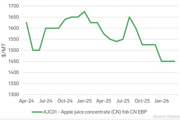 截至 3 月 31 日,低酸苹果浓缩汁(中国离岸价)的 Expana 基准价格为每吨 1,450 美元,与上月持平,同比下降 10.8%。