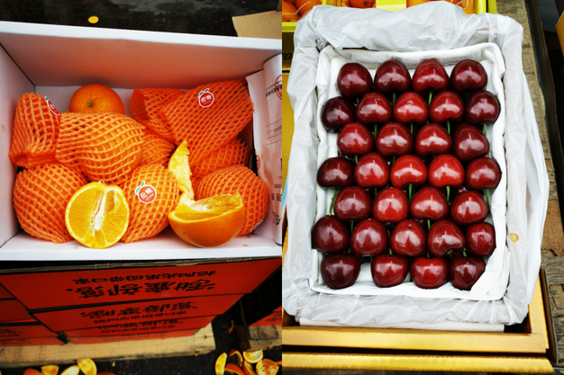 国产水果方面,在售当季果品主要包括金钻凤梨、伦晚橙礼盒装以及大连樱桃等。大连樱桃1.5斤精品装约售¥100-110/件。商户表示,樱桃口感与往年接近,但因今年整体水果采购量较少,走货较往年同期迟缓。