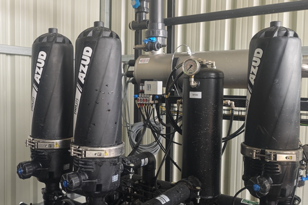 "第一阶段使用空气辅助 AZUD Helix Automatic 设备进行机械过滤,分为 100 微米和 5 微米两个过滤级别,可去除大部分有机和无机颗粒。"