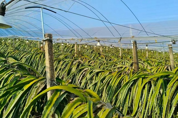 位于广西南宁的隆一盛火龙果基地种植面积约800亩,年产红心火龙果约3000吨。公司负责人董经理介绍,南宁主产区火龙果通常在9月20日前后开始开灯,灯照果采收期可持续至次年3月。"不过,本季受低温天气影响,部分果园出现烧叶现象,叶片发黄,植株生长受到抑制。"