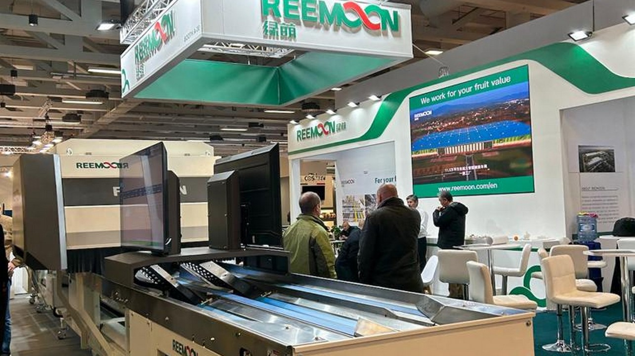 绿萌的展位位于展会一楼的水果物流机械大厅区域。绿萌专门从事分拣机和分拣技术运作。// The stand of Jiangsi Reemoon Sorting Technology Holdings at the Fruit Logistica machina hall area on the first floor. Reemoon specializes in sorting machine and sorting technologies.