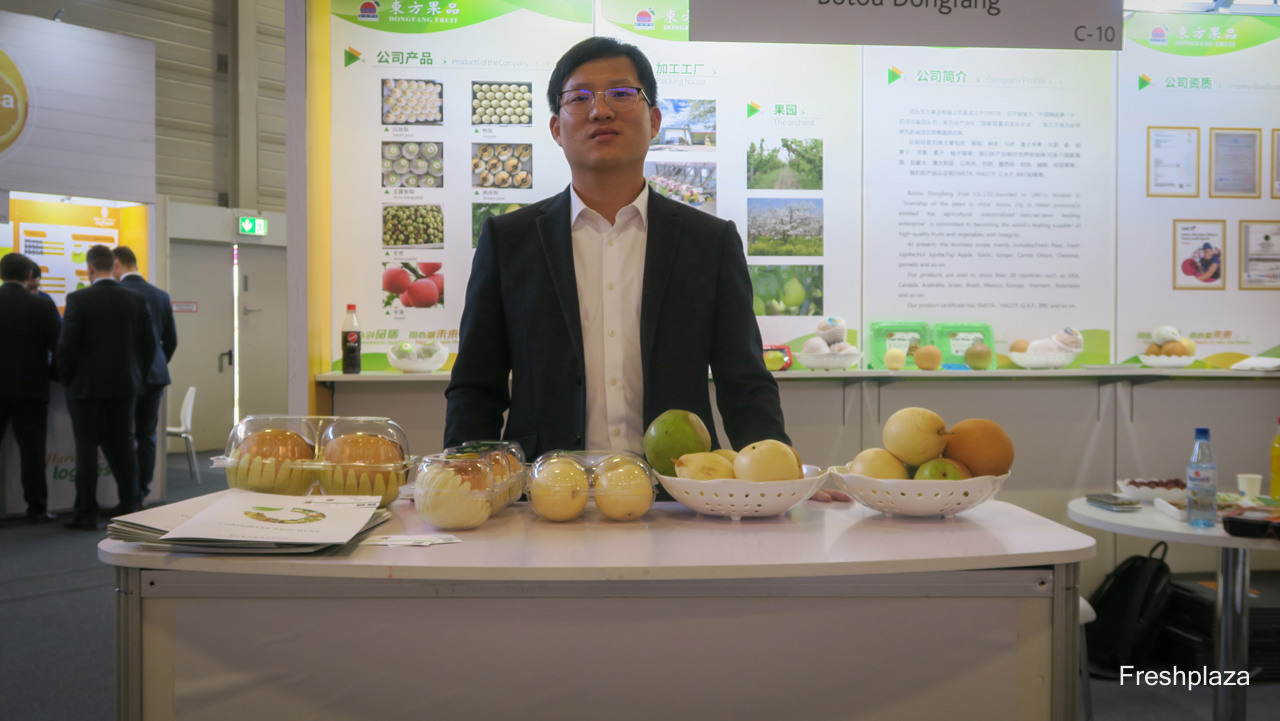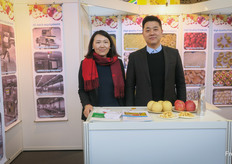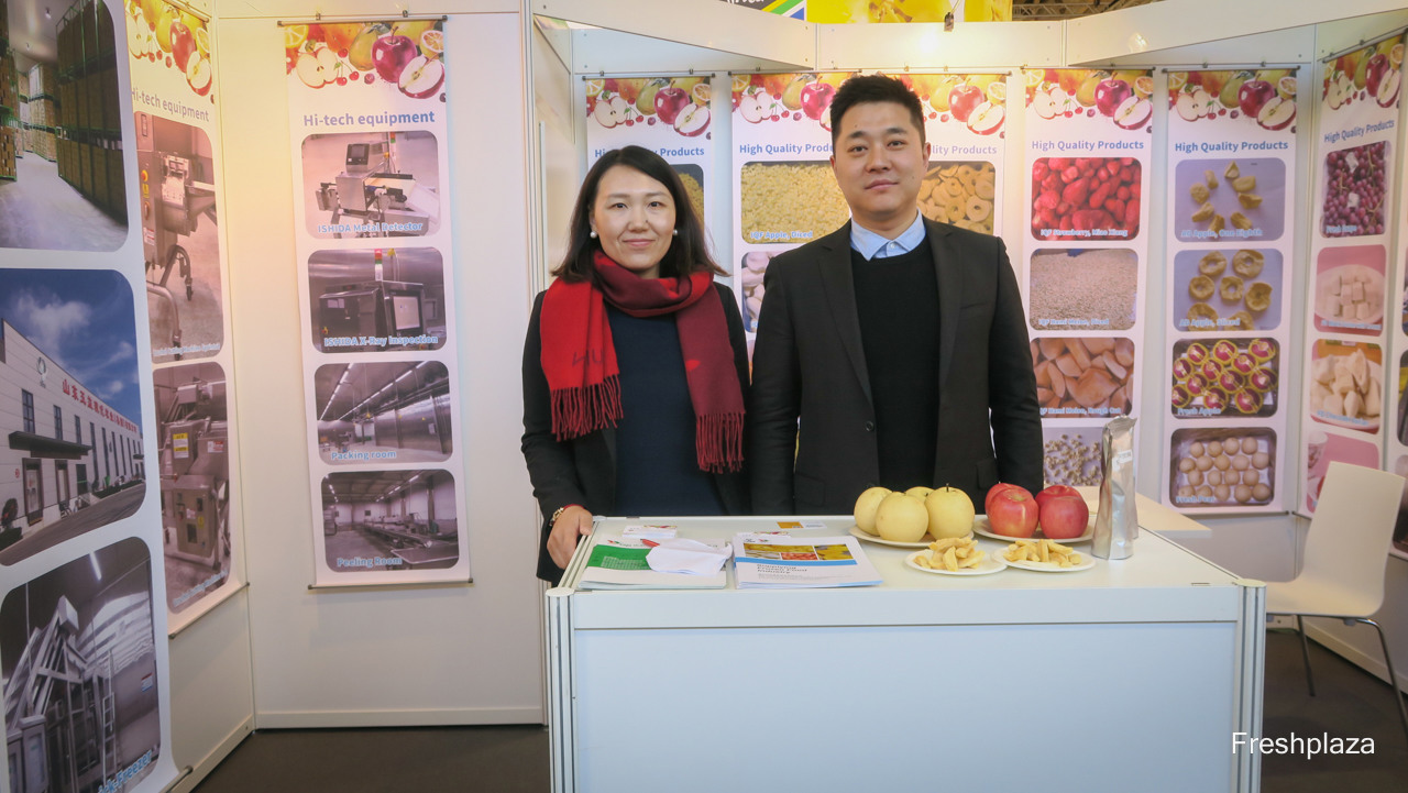 该公司主要参加亚洲果蔬展,这是首次参加柏林果蔬展。其现在生产冻干和新鲜的苹果和梨产品。今年是生产冷冻食品的第一年。照片上是Wang Fengjiao(Jessica),还有 Zhou YunQing。/ The company mostly attends Asian Fruit Logistica, Berlin is the first time. It now does freeze dried and fresh apple and pear products. First year for frozen foods. On the photo are Wang Fengjiao, or Jessica, and Zhou YunQing.