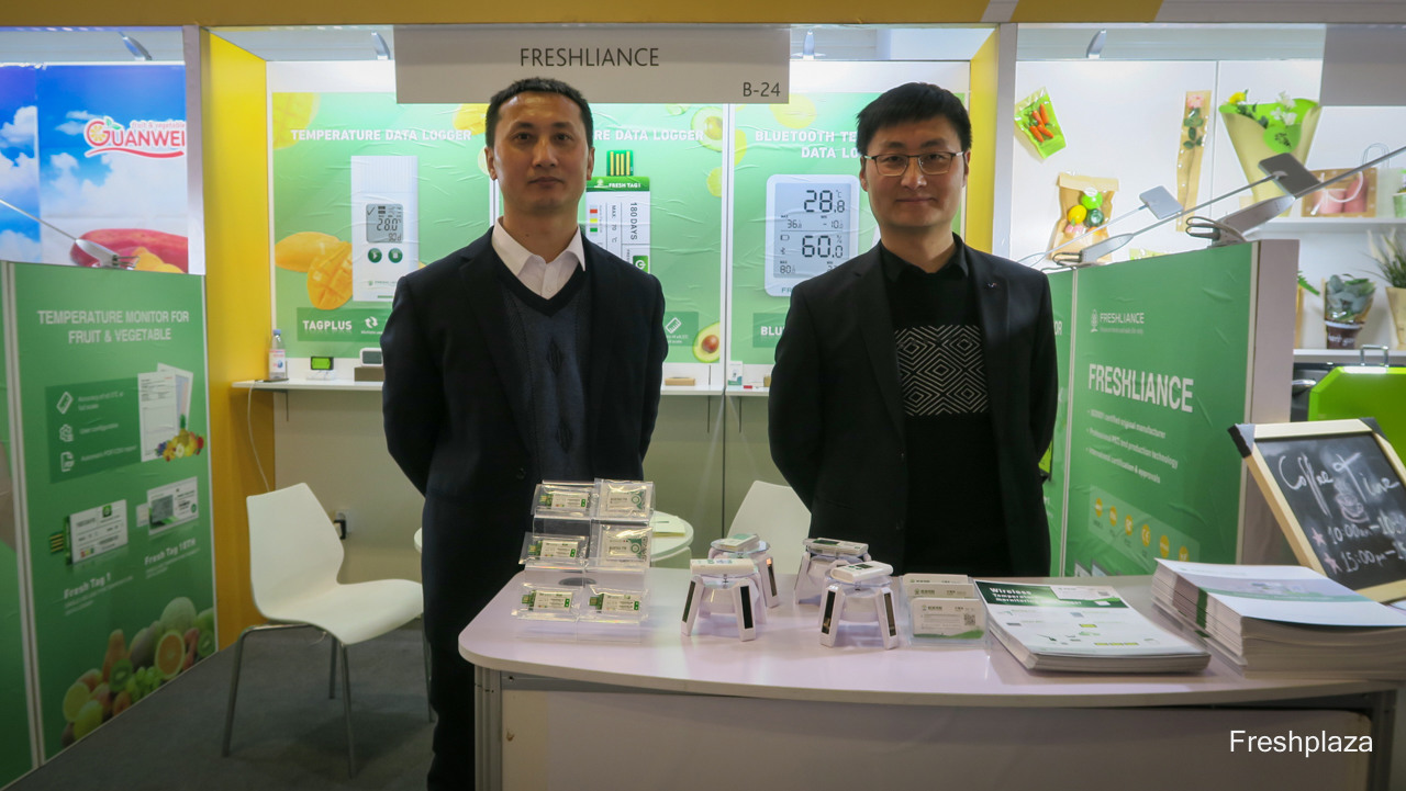 鲜境物联(Freshliance)为冷链运输生产温度和湿度以及位置数据记录器。左边是营销经理刘德刚(Victor Liu)。/ Freshliance produces temperature and humidity and also location data loggers for cold chain shipments. To the left, Victor Liu.