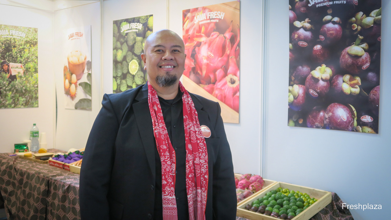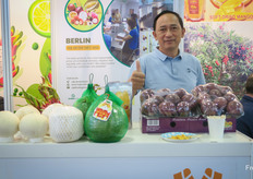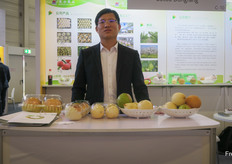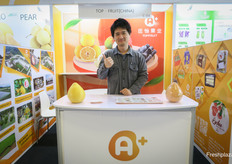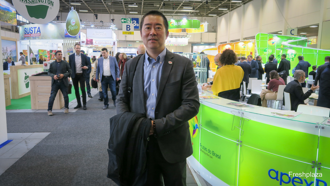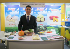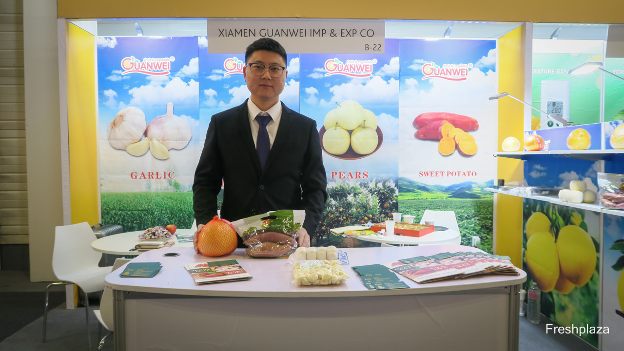 厦门冠威进出口有限公司(Xiamen Guanwei Imp & Exp Co)从中国出口柚子、大蒜和红薯。照片上是该公司总经理 Edvin Wang。/ Xiamen Guanwei Imp & Exp Co exports pomelo, garlic and sweet potato from China. On the photo is Edvin Wang, general manager.