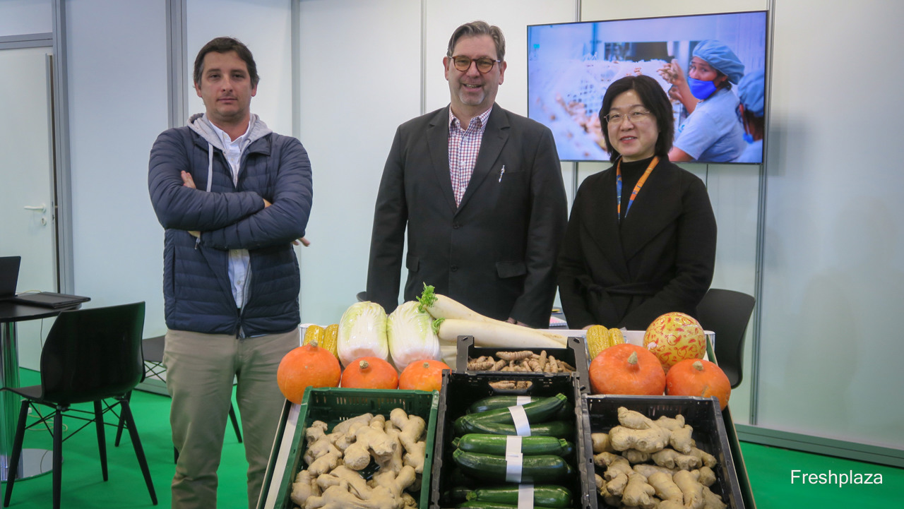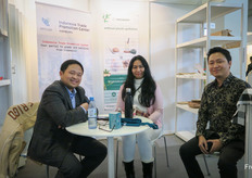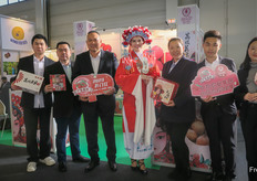 潍坊佳禾食品有限公司展位,来自秘鲁的Antonio Cook,来自德国的 Ralf Settels 和来自中国潍坊的张敏。该公司代表来自秘鲁和中国的一群种植者,不仅是进口商,还有种植者本身。/ Weifang Jiahe Group with Antonio Cook from Peru, Ralf Settels, from Germany Min Zhang from Weifang, China. The company represents a groups of growers from Peru and China, not only importers but growers themselves.