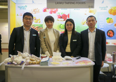 莱芜泰丰食品有限公司出口大蒜、生姜、苹果和梨。现在生姜价格很高,COVID 导致冬季产量减少和需求高。照片上是 Nic Zhang、Bella、Stacey 和 Peter。/ Laiwu TaiFeng Foods exports garlic and ginger, apple and pears. Now ginger prices are high because less production and high demand in Winter with COVID. Nic Zhang, Bella, Stacey and Peter.