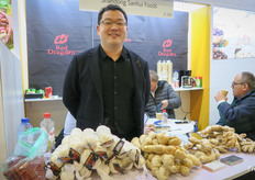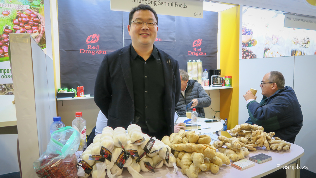 山东省三慧食品有限公司的毕周。今年生姜价格高,这要是由于播种期间的大量降雨导致许多植物被损坏。生姜产量减少了40%,市场上的数量有限。此外,秘鲁和巴西生姜也如此。/ Shandong SanHui Foods with Tom Bi. Ginger prices are high. During planting it rains and many plants were damaged. There is 40% less ginger from the soil, quantity is limited.  Also Peruvian and Brazilian ginger.