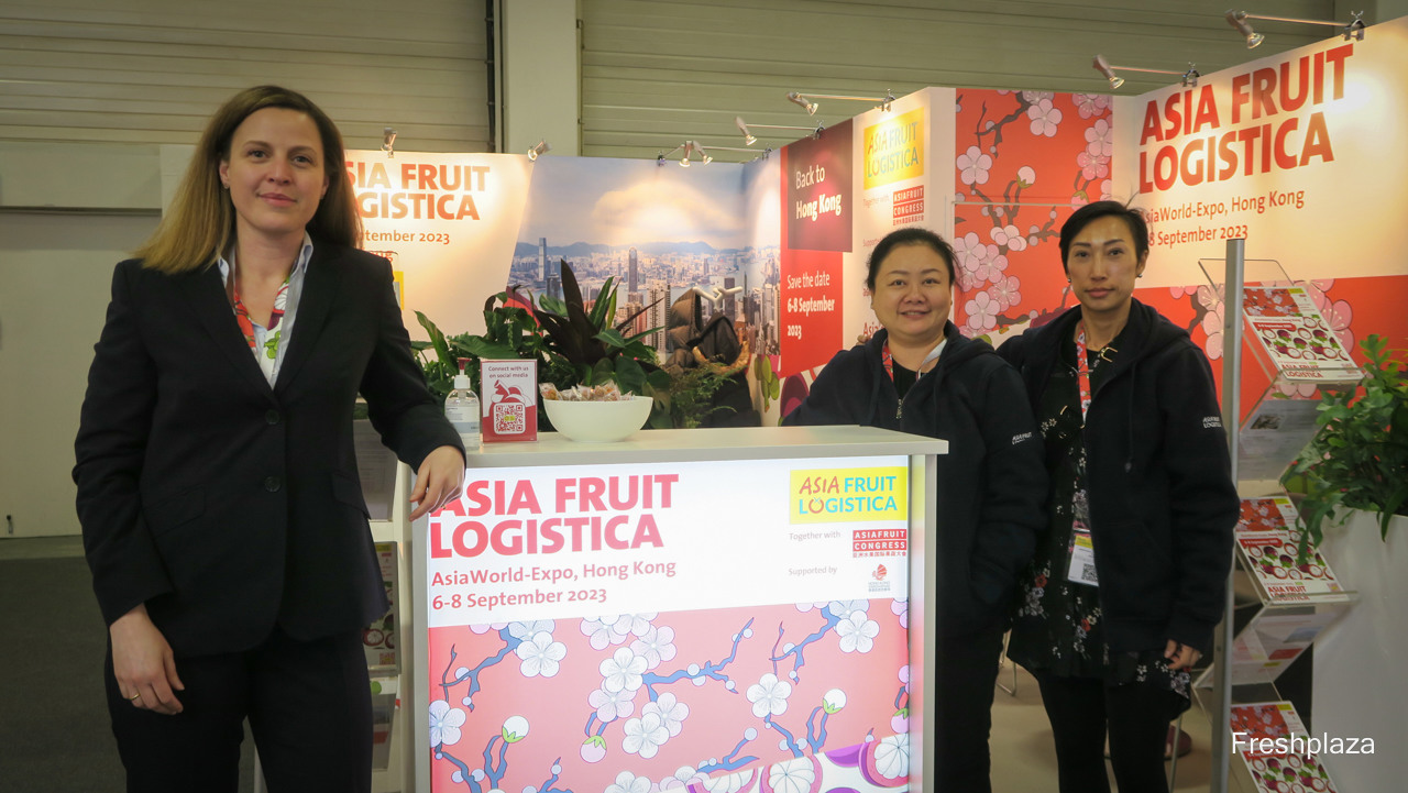 Asia Fruit Logistica 团队:马丽莉(欧洲 & 中东市场经理)Marie Berkefeld、Pitchayanun Suriyatananon 和 Kay Kwok。/ The team of Asia Fruit Logistica with on the photo Marie Berkefeld, Pitchayanun Suriyatananon and Kay Kwok.