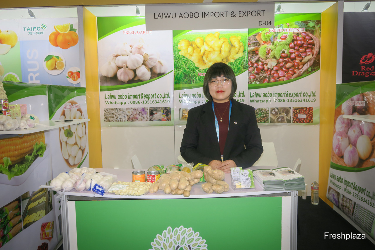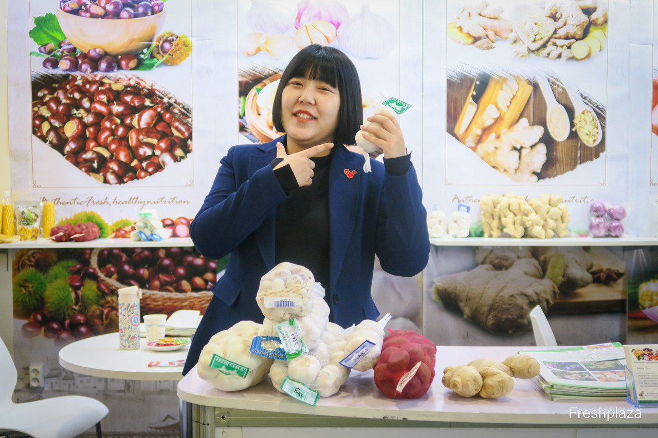 来自中国济宁富源果菜有限公司的沈童(Ella Shen)。今年冬天,全球生姜市场表现强劲。/ Ella Shen at Jining Fuyuan Fruits & Vegetables from China. The global market for ginger is strong this Winter.