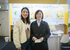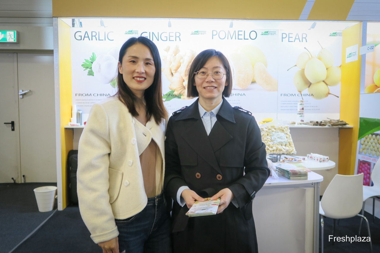 来自中国的济宁兴源果蔬有限公司是一家新鲜大蒜和生姜的种植商和出口商。照片上是马园园和王菲菲。/ Jining GreenStream Fruit & Vegetables Co., Ltd from China is a grower and exporter of fresh garlic and ginger. On the photo are Maggie Ma and Julie Wang.