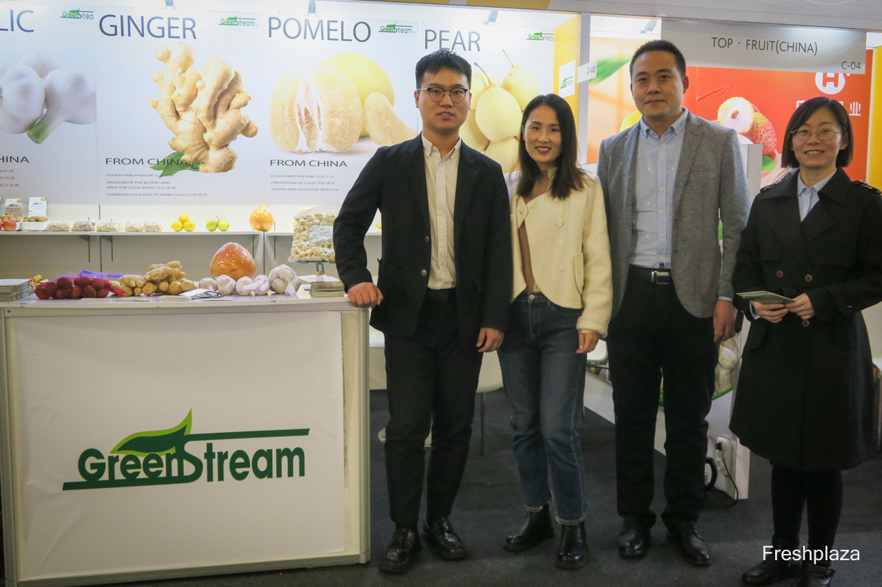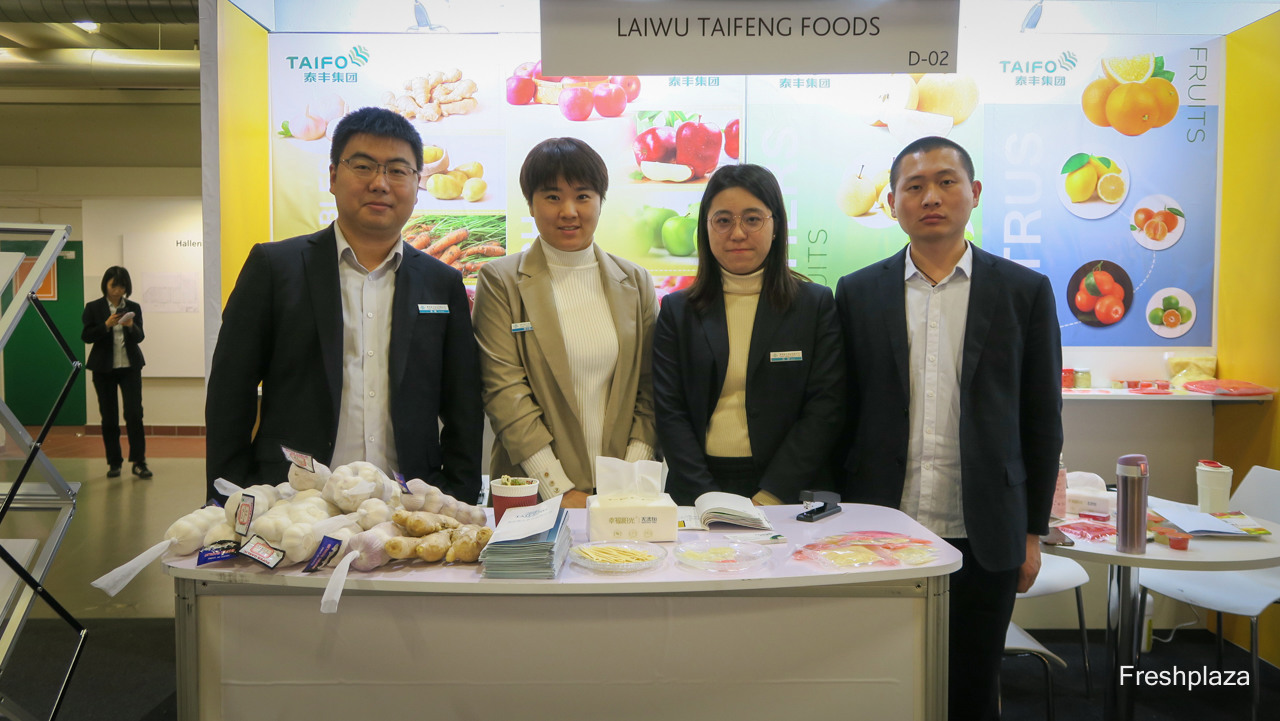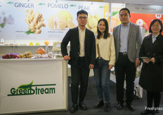 来自中国的济宁兴源果蔬有限公司是一家新鲜大蒜和生姜的种植商和出口商。照片上的是吕嘉霖、王菲菲、张书涵、马园园。/ Jining GreenStream Fruit & Vegetables Co., Ltd from China is a grower and exporter of fresh garlic and ginger. On the photo are Colin Lv, Julie Wang, Victor Zhang and Maggie Ma.