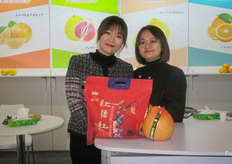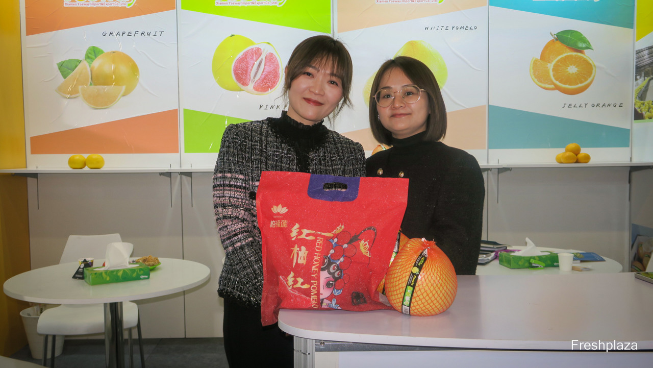 漳州市柚知味果业有限公司是一家来自中国的柚子种植商。其展出的包装代表兔年。右边是销售经理林阿娟(Julia Lin)。/ Xiamen Yosway Import and Export is a grower of pomelo from China. The packaging represents the year of the rabbit. To the right, sales manager Julia Lin.