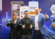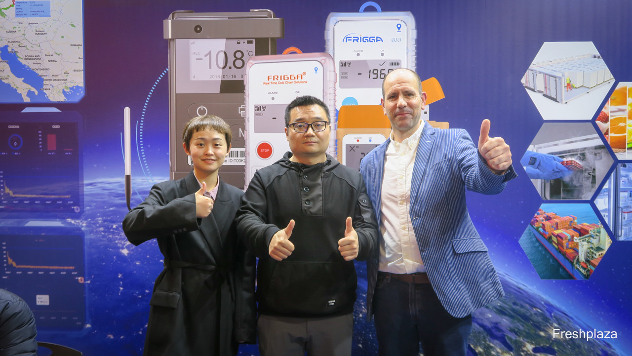 上海鼎为物联技术有限公司的国际销售团队,该公司推广其 Frigga 品牌的冷链数据监控解决方案。中间是首席执行官兼创始人潘奇,右边是来自智利的国际业务开发人员 Gonzalo Robles Lama。/ The international sales team at DEWAV IOT, promoting its Frigga brand of cold chain data monitoring solutions. In the middle is Paddy Pan, CEO and founder, and to the right is Gonzalo Robles Lama, international business developer from Chile.