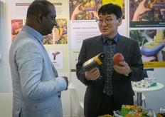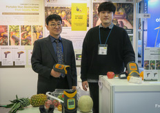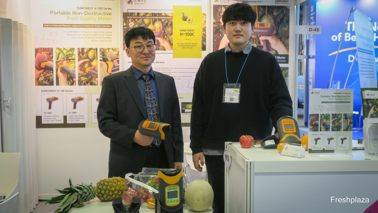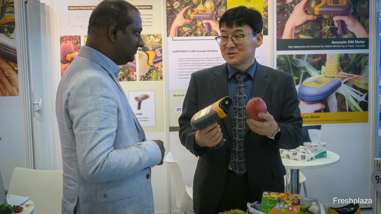 来自 SunForest 的 Jay Hwang,这是一家韩国公司,专门从事芒果、牛油果、甜瓜和其他水果的白利糖度和干物质等无损检测技术。右边是该公司研发中心的工程师 Kang Jeong-Hwan。/ Jay Hwang from SunForest, a Korean company specializing in non-destructive testing technologies for, among other measures, brix and dry matter in mango, avocado, melons and other fruits. To the right is Kang Jeong-Hwan, engineer at the R&D Center.