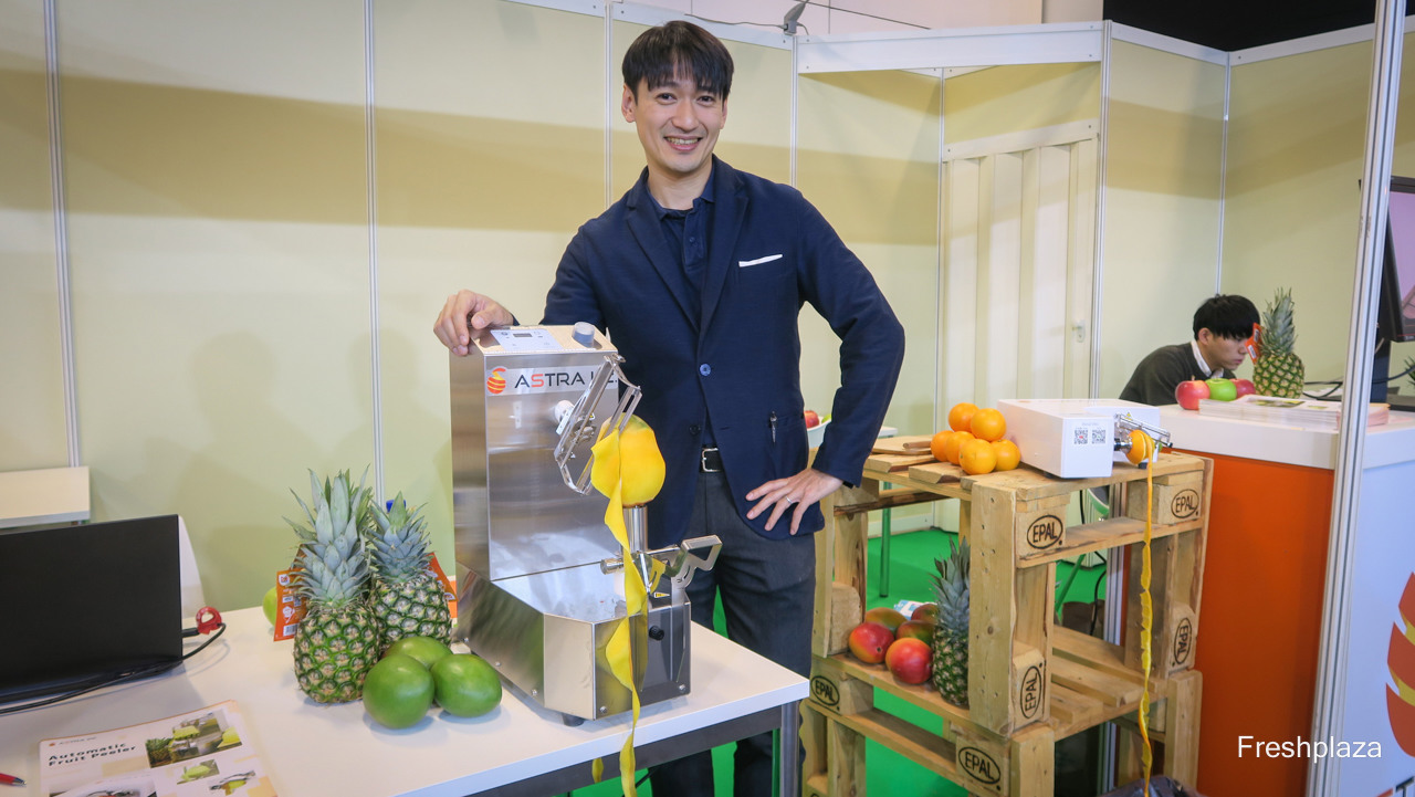 Astra Inc 设计和生产水果削皮机。该公司的全球销售额在增长,其国际营业部部长竹下遼(Ryo Takeshita)表示,更好的削皮可造就更好的水果。/ Astra Inc designs and produces fruit peeling machines. The company sees its global sales growing. Better peeling makes for better fruits, says Ryo Takeshita, international sales.