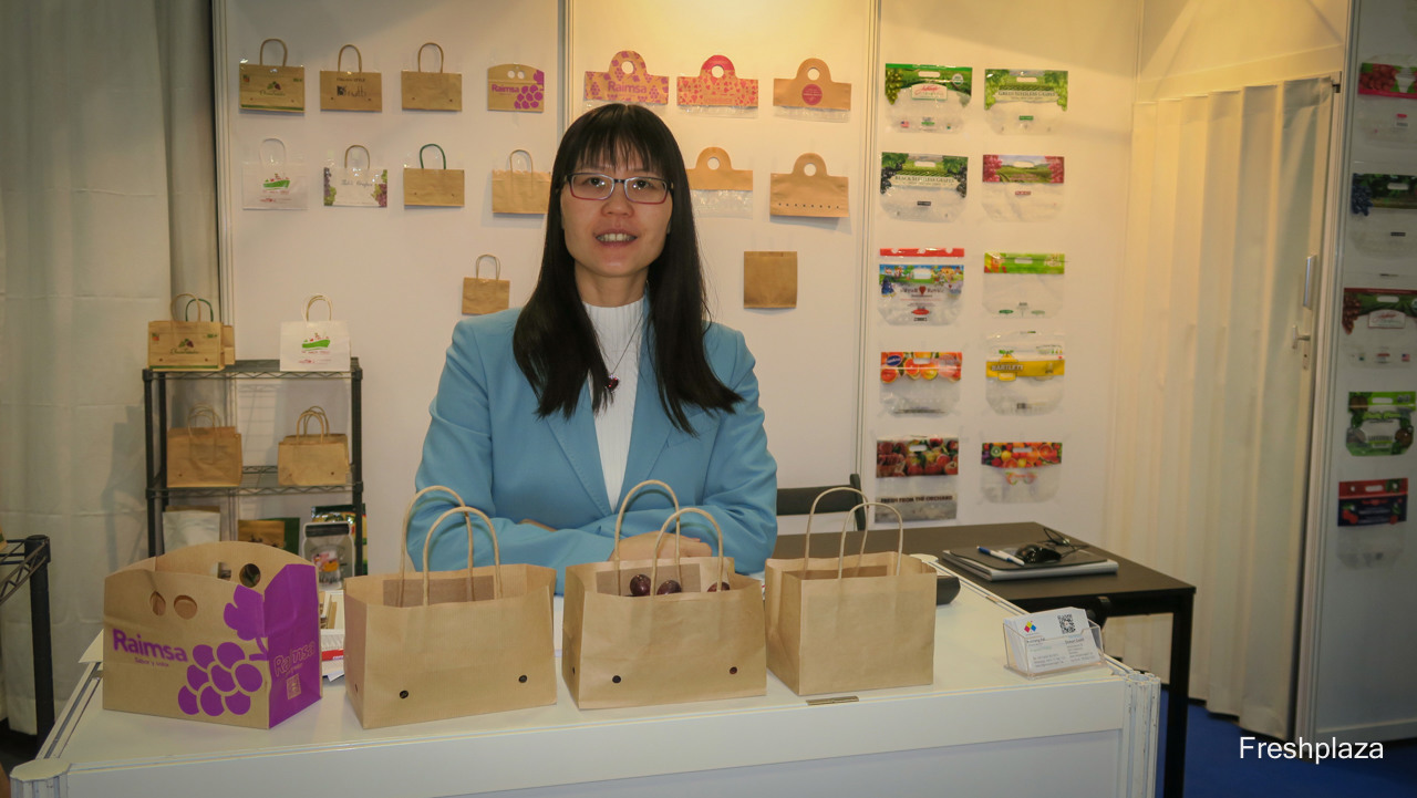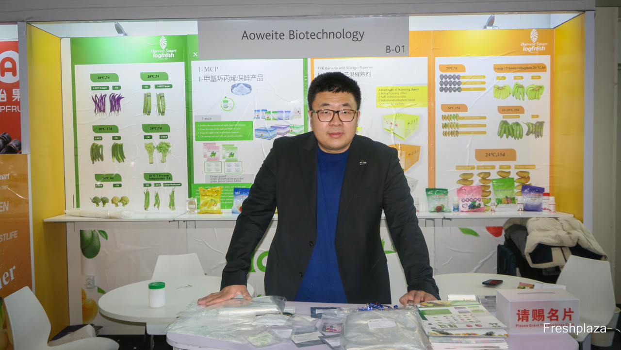 山东营养源食品科技有限公司在 Fruit Logistica 展会上展示了其防雾气调包装,这是该公司全新水果和蔬菜保鲜解决方案系列的一部分。照片上是国际销售经理 Tony Chen。/ Aoweite Biotechnology presented its anti-fog modified atmosphere packaging at Fruit Logistica, part of the company's line of new fresh-keeping solutions for fruits and vegetables. On the photo is Tony Chen, International Sales Manager.
