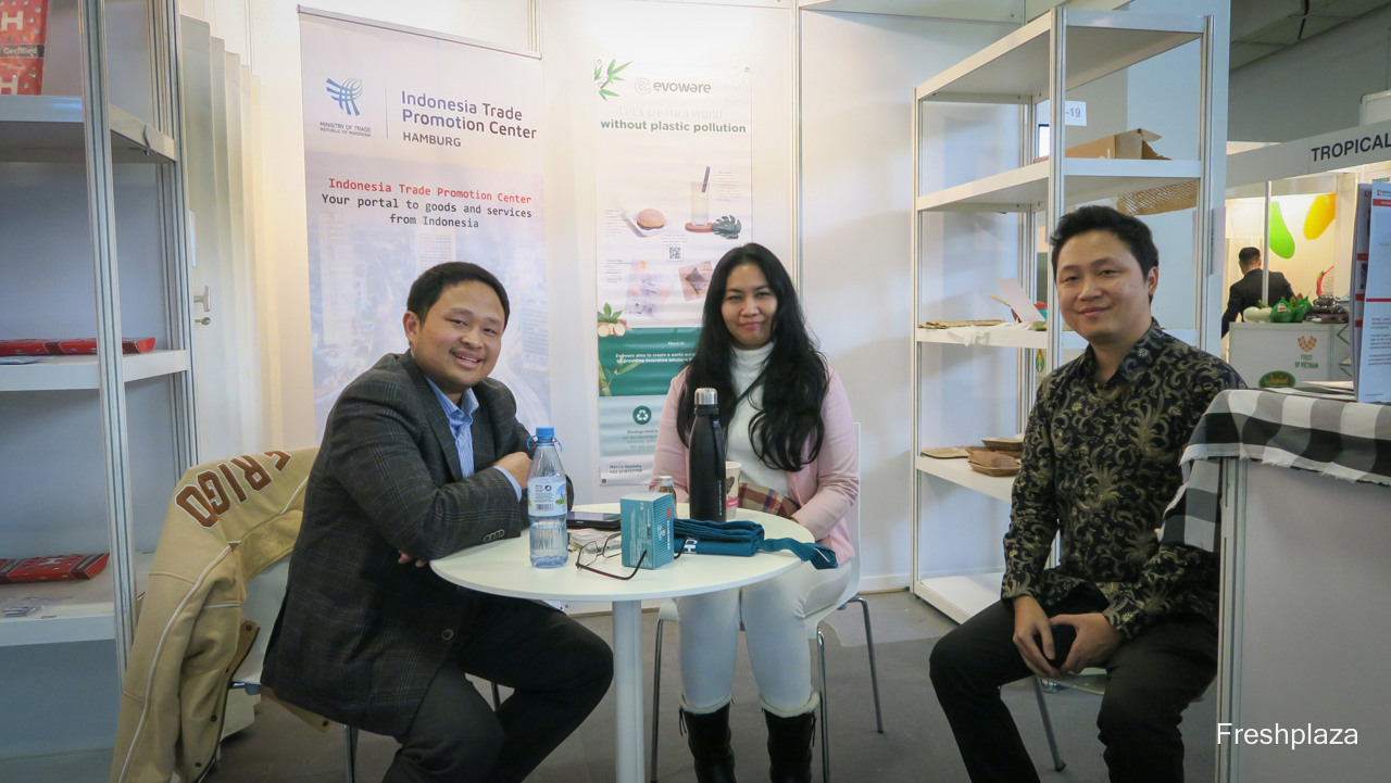 来自 Humitrap 的 Valerie,与 Recycleble 和 Evoware,他们生产由海藻、大米和甘蔗制成的可持续包装,这两家公司均来自印度尼西亚。/ Humitrap with Valerie, taking out humidity and Recycleble, and Evoware, producer of sustainable packaging made from seaweed, rice, suger cane, both from Indonesia.