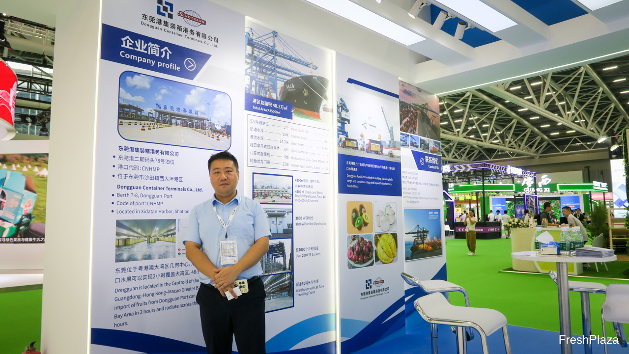 东莞港集装箱港务公司经营大批量生鲜产品运输。该港口是佳沛的官方合作伙伴。公司还提供冷藏仓库业务和监测服务。图片上是商务部副经理刘振。/ The SinoTrans Dongguan Container Terminal moves significant amounts of fresh produce. The Port is an official cooperation partner of Zespri. The company also operates reefer warehouses and inspection services. On the photo is Athos Liu, Commercial Department Vice Manager.