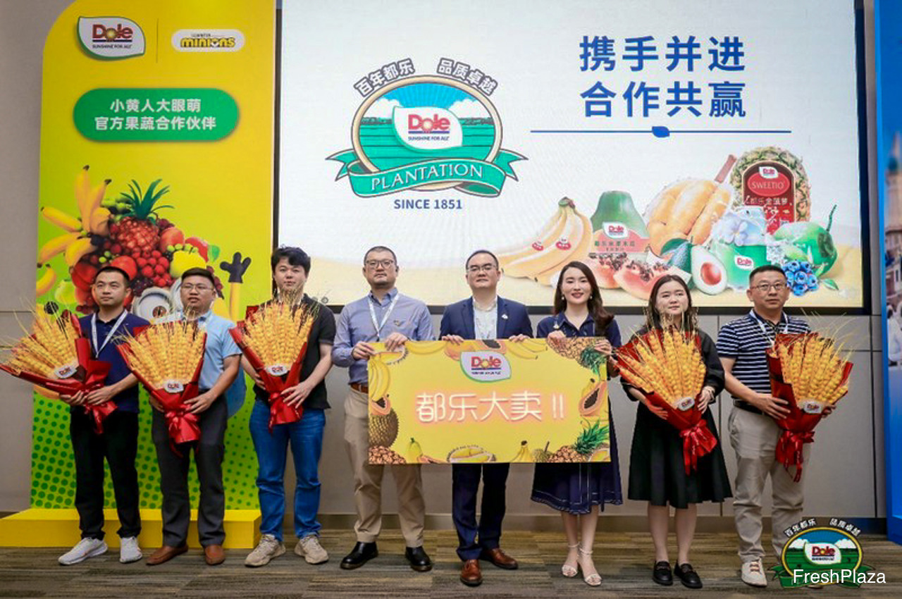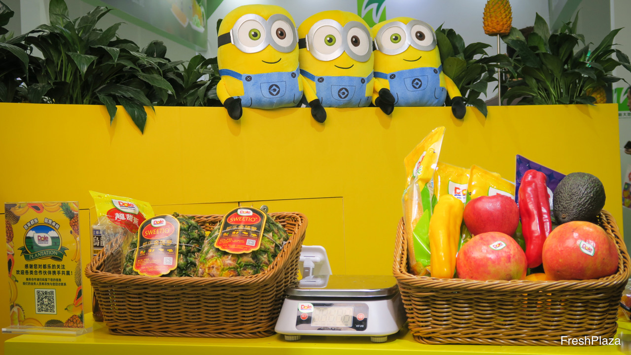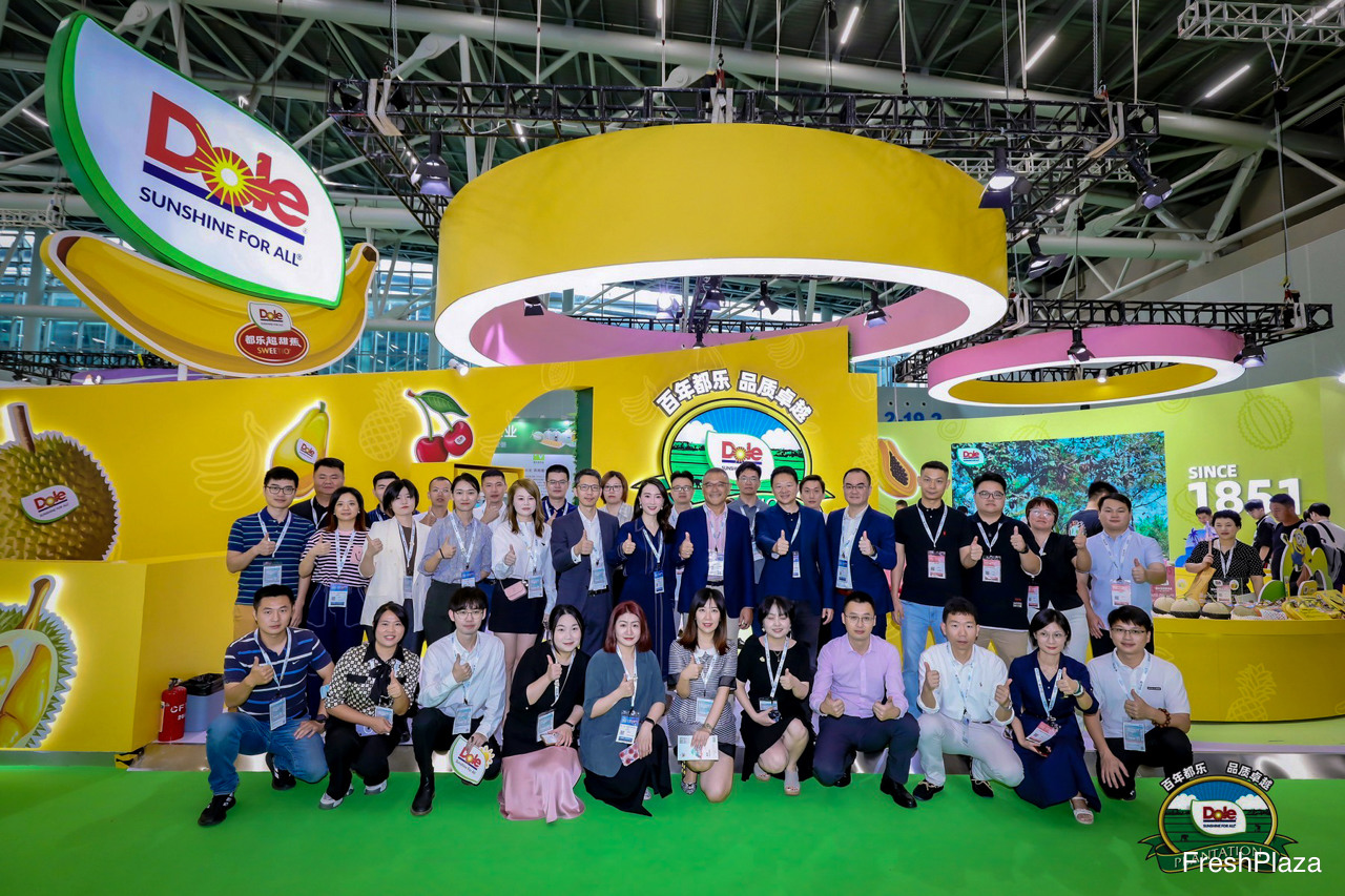 都乐中国派出庞大代表团出席。展位上方清晰可见该公司理念“Sunshine for All”。/ Dole China was present with a large delegation. The company's slogan Sunshine for All visible above the stand.