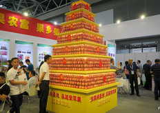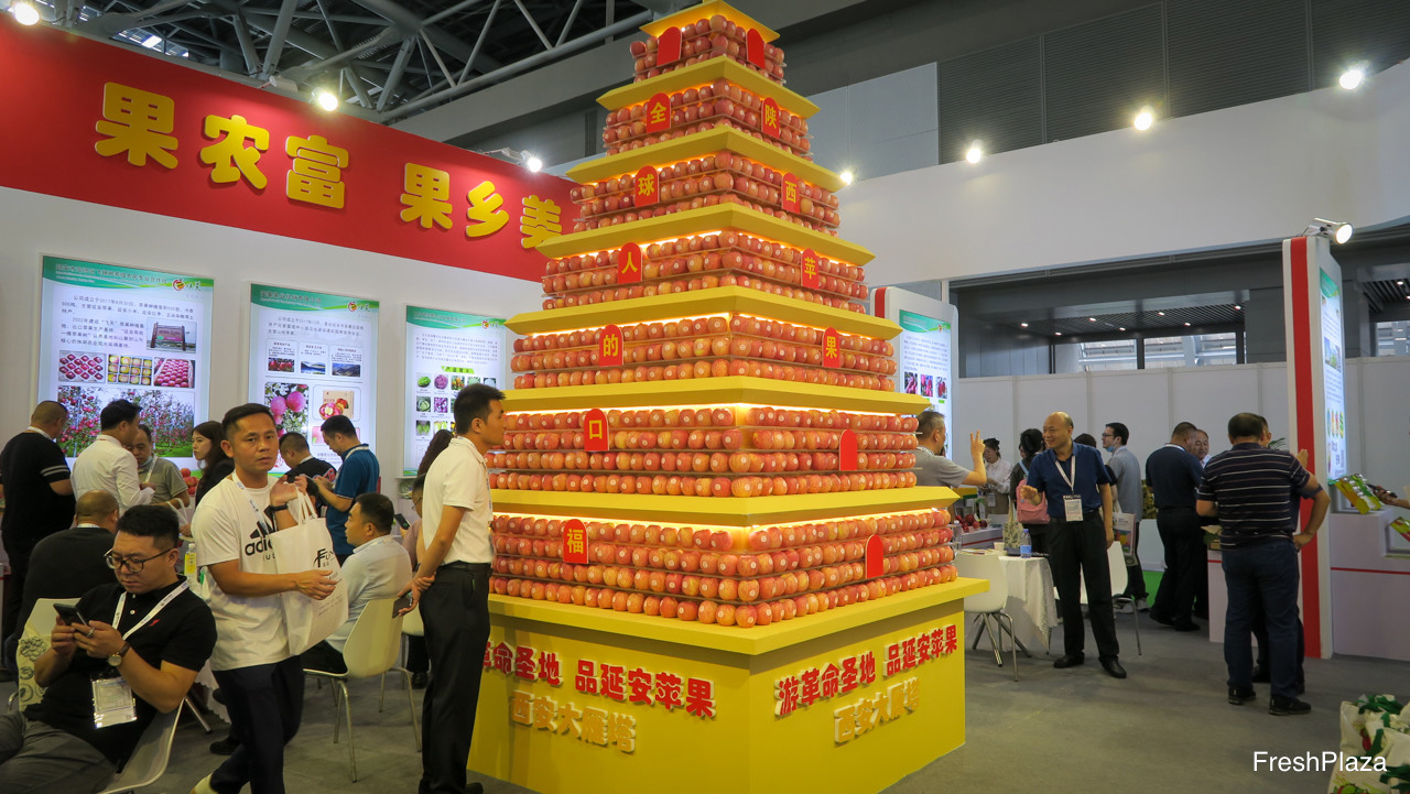 陕西水果展厅里的大型苹果展示塔。苹果是当地的主要水果品类。/ Large apple pagoda on display at the Shaanxi Fruits Pavillion. Appels are a major fruit from the region.