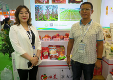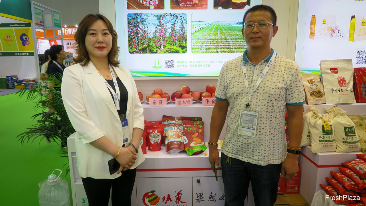 陕西黄土高坡农林畜发展有限公司,是一家延安苹果农民合作社。八月起早熟品种已上市,十月将上市更多品种。图为蔡青总经理和唐先生。今年苹果收成预计和去年持平。/ Shaanxi Huangtugaopo Company, a YanAn apple cooperative. There is one early apple variety already on the market from August. On the photo are Cai Qing and Tang Zhongzin. The other apples arrive in October. The harvest is expected to be same as last year.