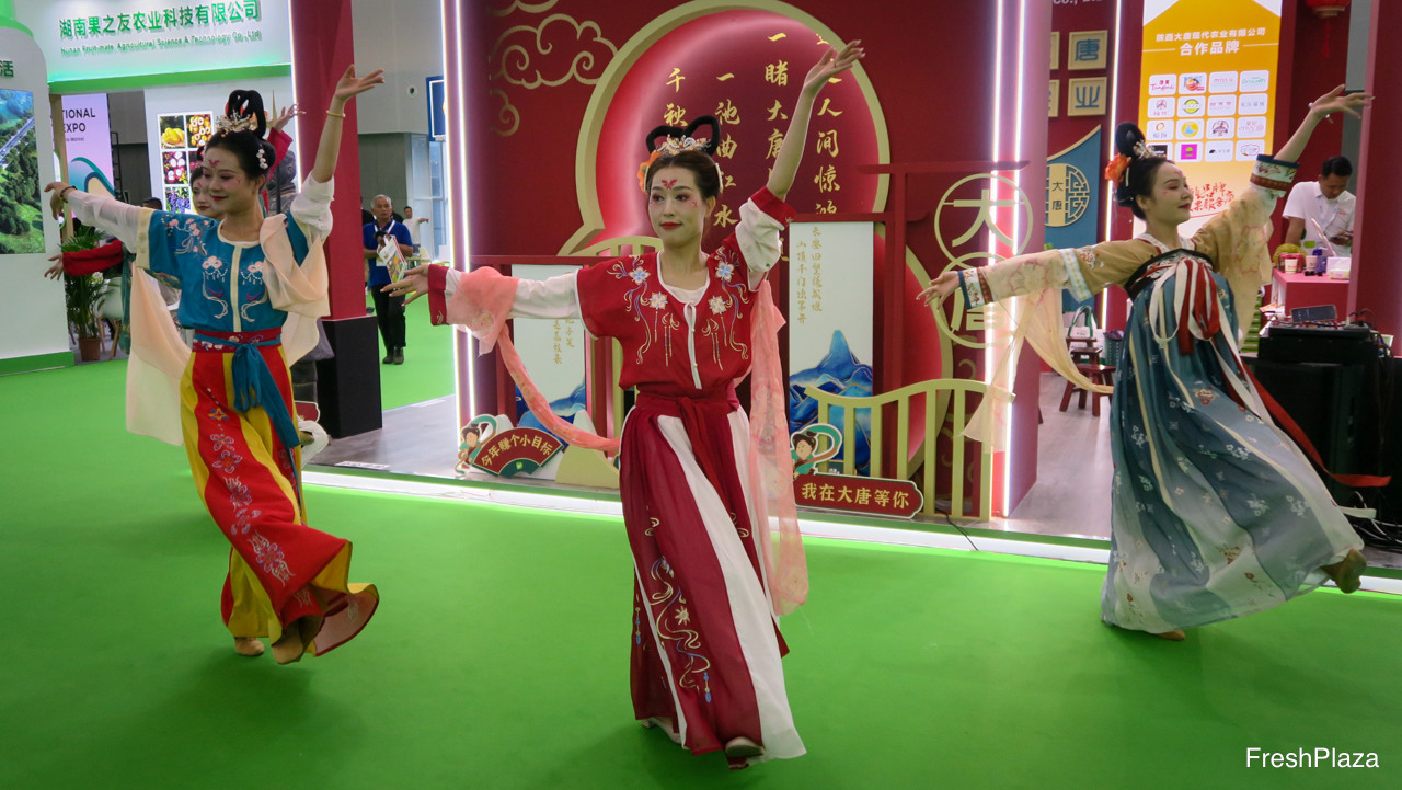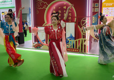 大唐农业展位的传统舞蹈。陕西大唐现代农业作为国产与进口水果品牌的经销商,以批发市场为销售渠道。公司以“唐美”为品牌销售陕西果品,如猕猴桃、苹果等。/ Traditional Dance at the booth of DaTang Agriculture. Shaanxi DaTang Modern Agriculture is active on the wholesale market as distributor of Chinese and international brands. The company also markets Shaanxi products like kiwi fruit and apples under the Tang Mei brand.