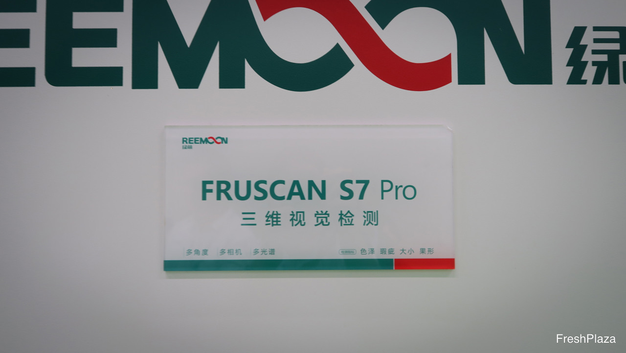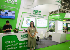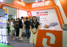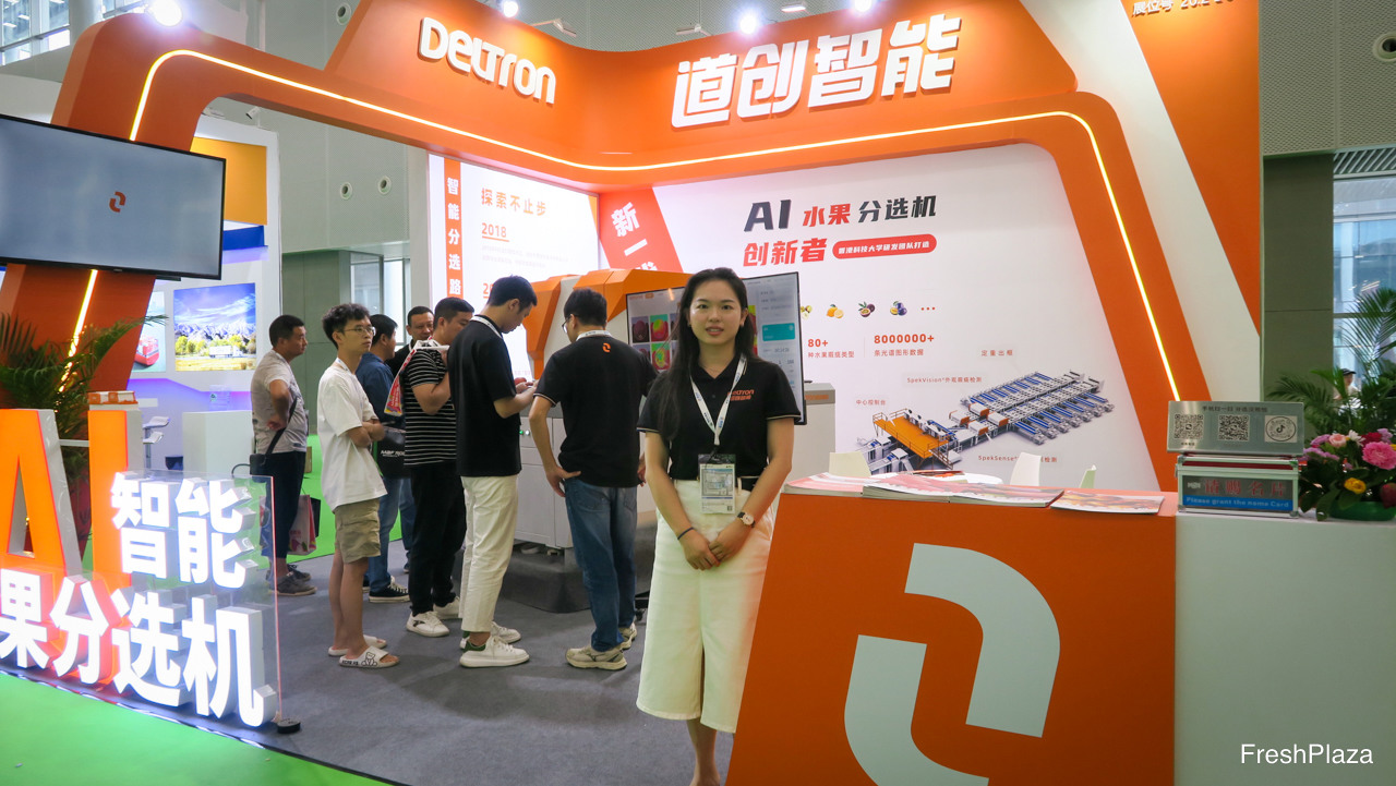 深圳的道创智能公司展台。公司以SpekSense和SpekVision为核心技术,并以人工智能科技赋能,于分选线上为水果进行质量检测。图为来自该公司的Ria。/ The stand of Deltron from Shenzhen. Their technology SpekSense and SpekVision does quality testing through scan technology and the entire sorting line, powered by AI technology. On the photo is Ria.